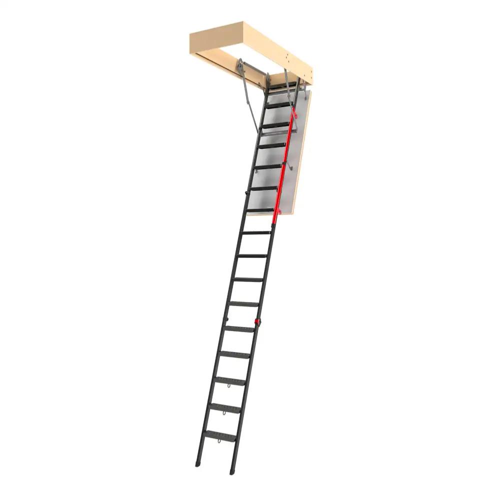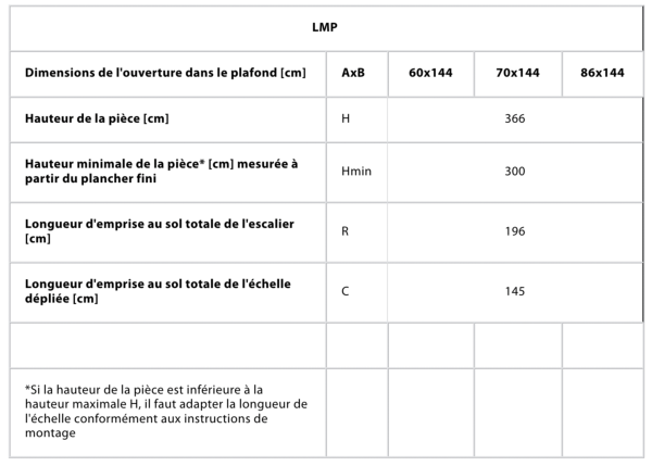 Les escaliers LMP sont une nouvelle génération d’escaliers avec échelle métallique, combinant un niveau élevé de sécurité avec un accès confortable aux combles. Cet escalier est disponible en 3 tailles, pour insertion dans un local d’une hauteur maximale de 366cm (Hauteur comprise entre sol fini et plafond) L’échelle de l’escalier est équipée d’un mécanisme d’allègement intégré dans la rampe et facilitant le pliage et le dépliage de l’échelle. Grâce à cela, il est possible d’exploiter pleinement l’échelle en utilisant la perche livrée avec l’escalier.