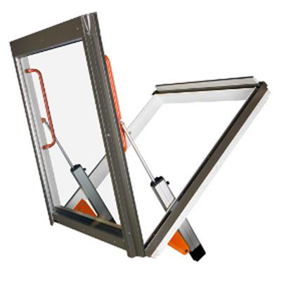 Cette fenêtre de désenfumage avec un ouvrant ayant l'axe de rotation en partie inférieure, permet l'évacuation des fumées par son effet de cheminée. L'ouvrant en état ouvert fait para-vent et optimise les valeurs aérodynamiques de désenfumage de cette fenêtre. La fenêtre est pourvue de 2 moteurs électriques à vérin en 24V et répond aux normes en vigueur EN 12101-2:2003. Une déclaration de conformité CE (E35/12101/07) est disponible
