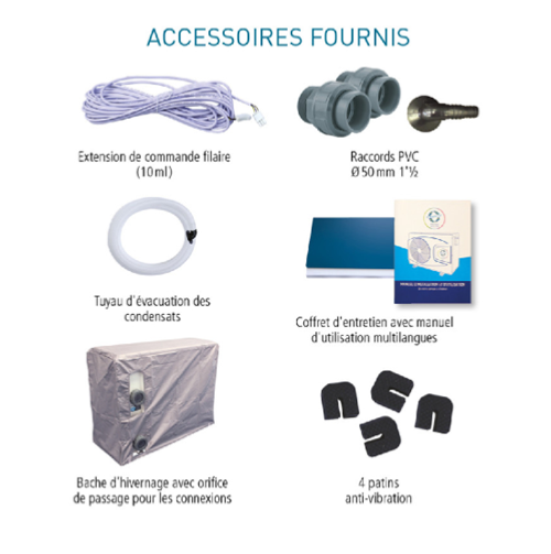 • 📦 Accessoires fournis (raccords, bâche, supports anti-vibration…)