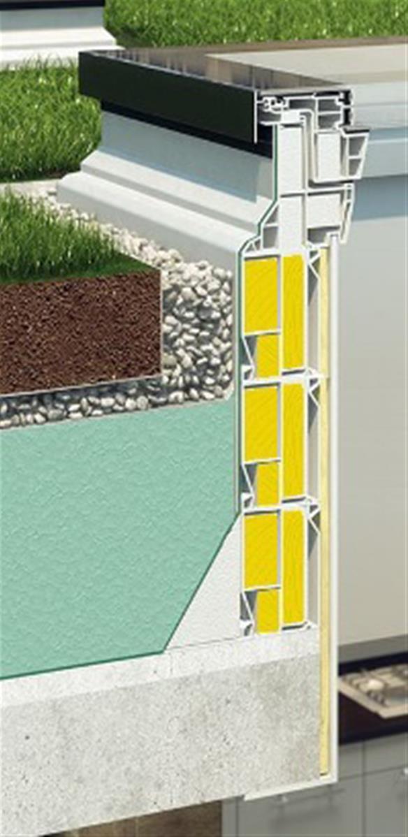La réhausse est constituée de profilés en PVC à chambres multiples (PVC gris recyclé) remplis par une isolation en EPS.