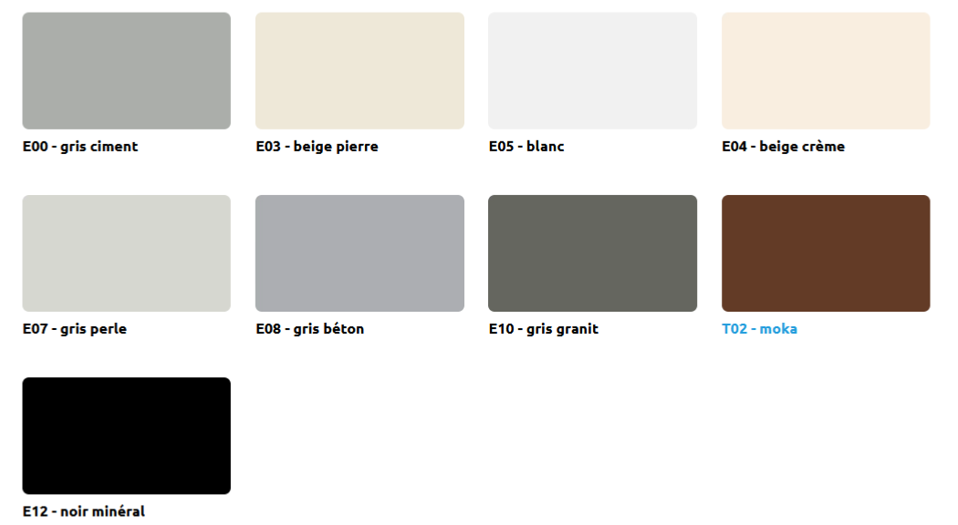 Couleurs : blanc, beige, gris perle, gris ciment, anthracite, chocolat. Consulter le nuancier
